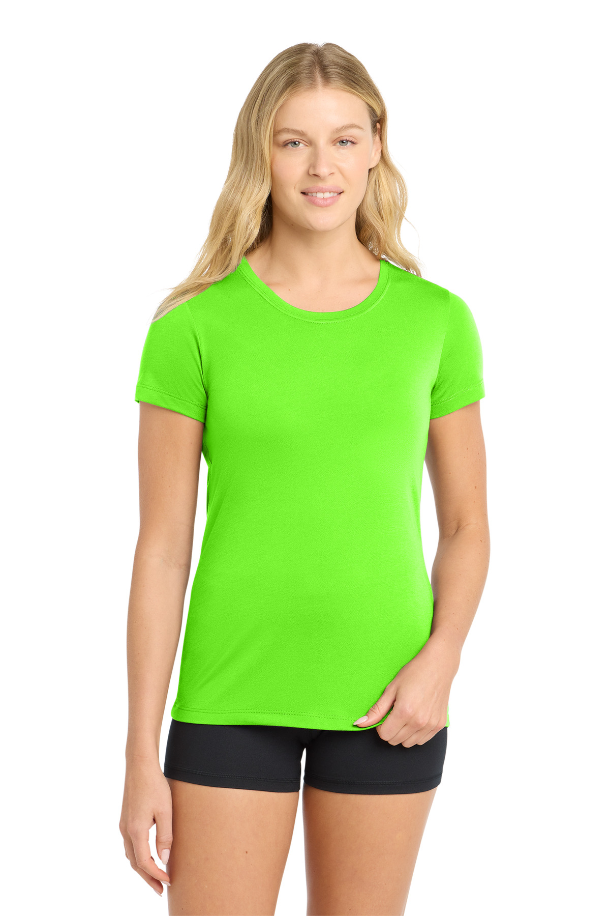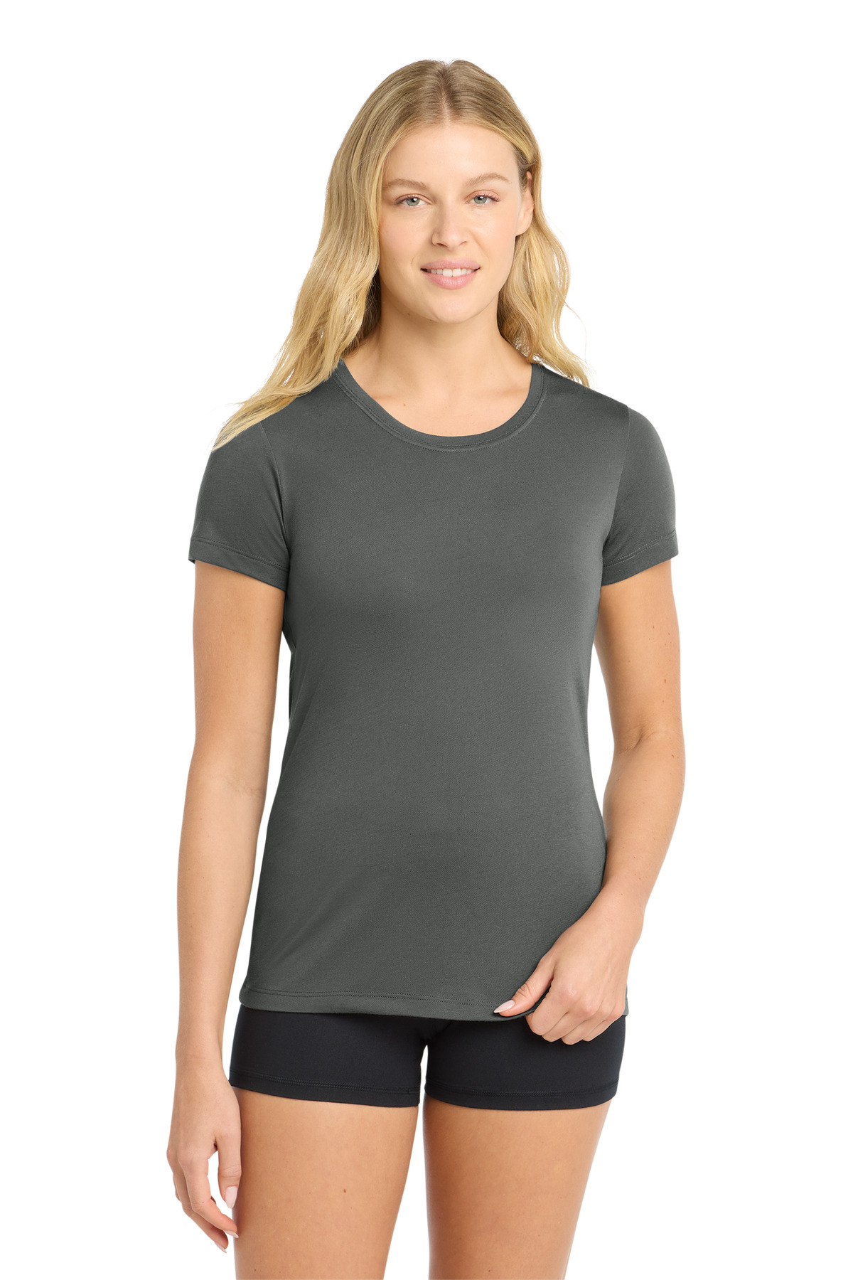 A soft cotton hand merges with color-locking, moisture-wicking performance in this tee that also has a matte finish. 4.7-ounce, 100% spun polyester jersey with PosiCharge technology Soft cotton hand Removable tag for comfort and relabeling Dyed-to-match neck taping Set-in sleeves