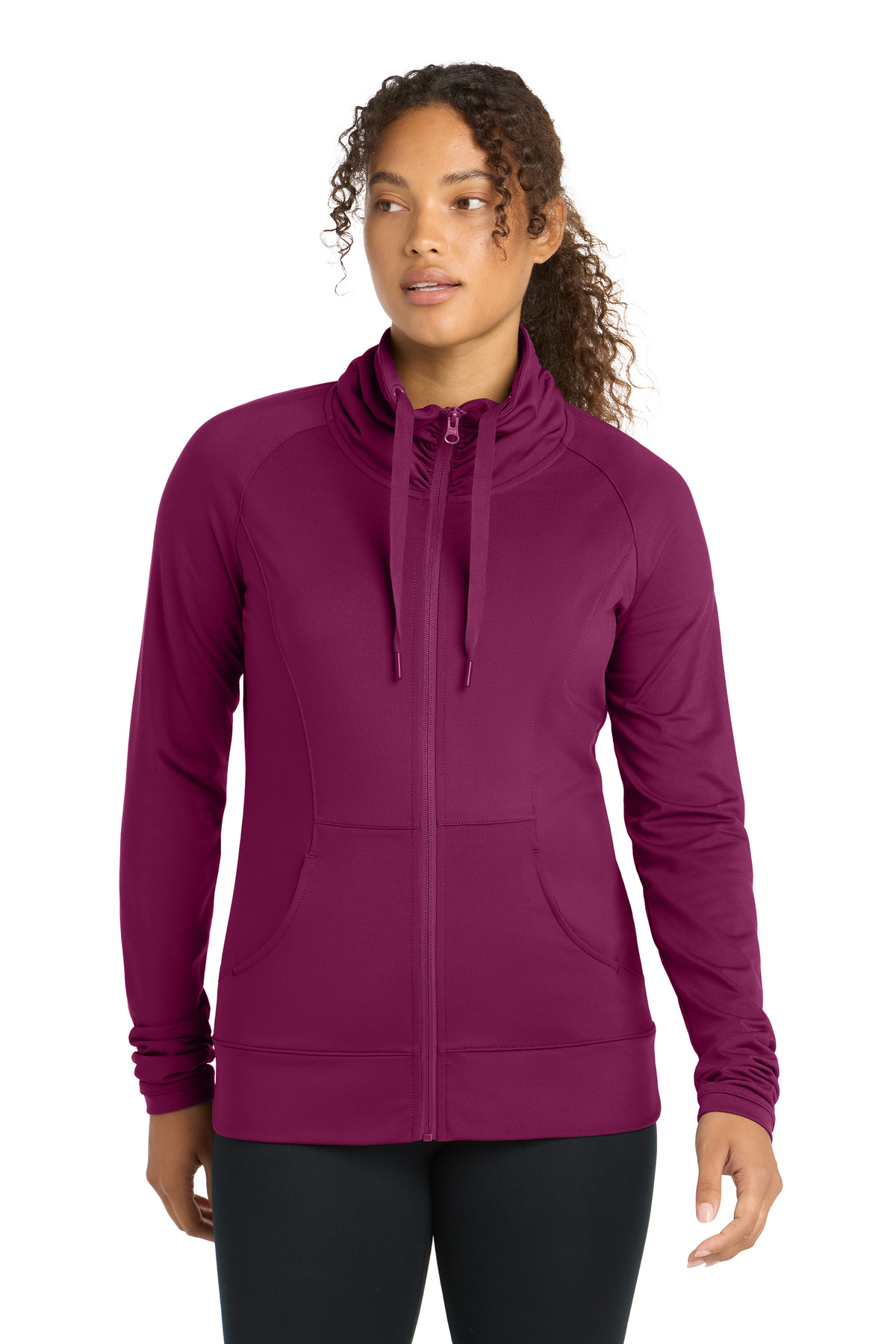 A stretchy, moisture-wicking performance jacket with a soft-brushed backing and unique cowl collar. | 6.8-ounce, 90/10 poly/spandex jersey Tag-free label Zip-through cowl collar with ruching Dyed-to-match drawcord Dyed-to-match Sport-Tek ® logo neck taping Reverse coil zipper Raglan sleeves Front pouch pockets Ruching at cuffs Self-fabric hem