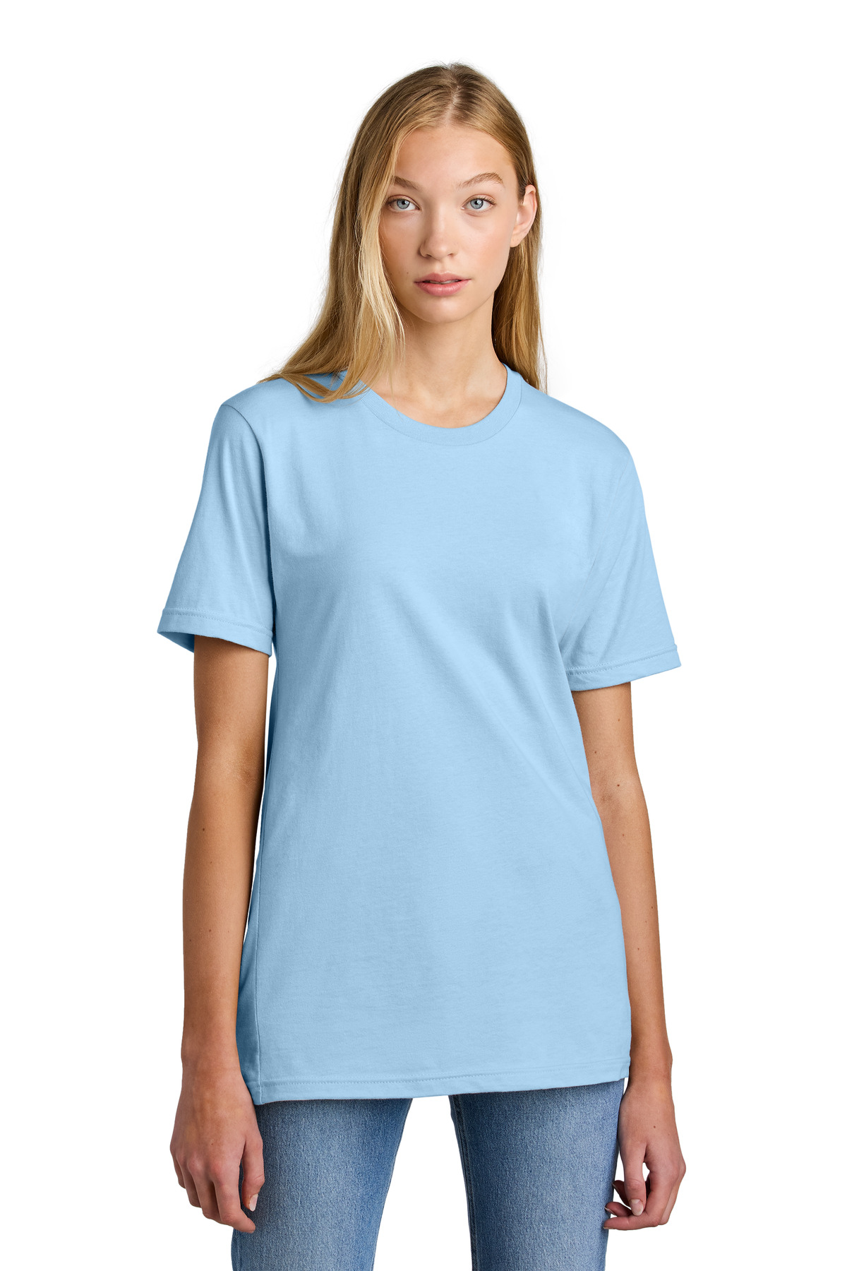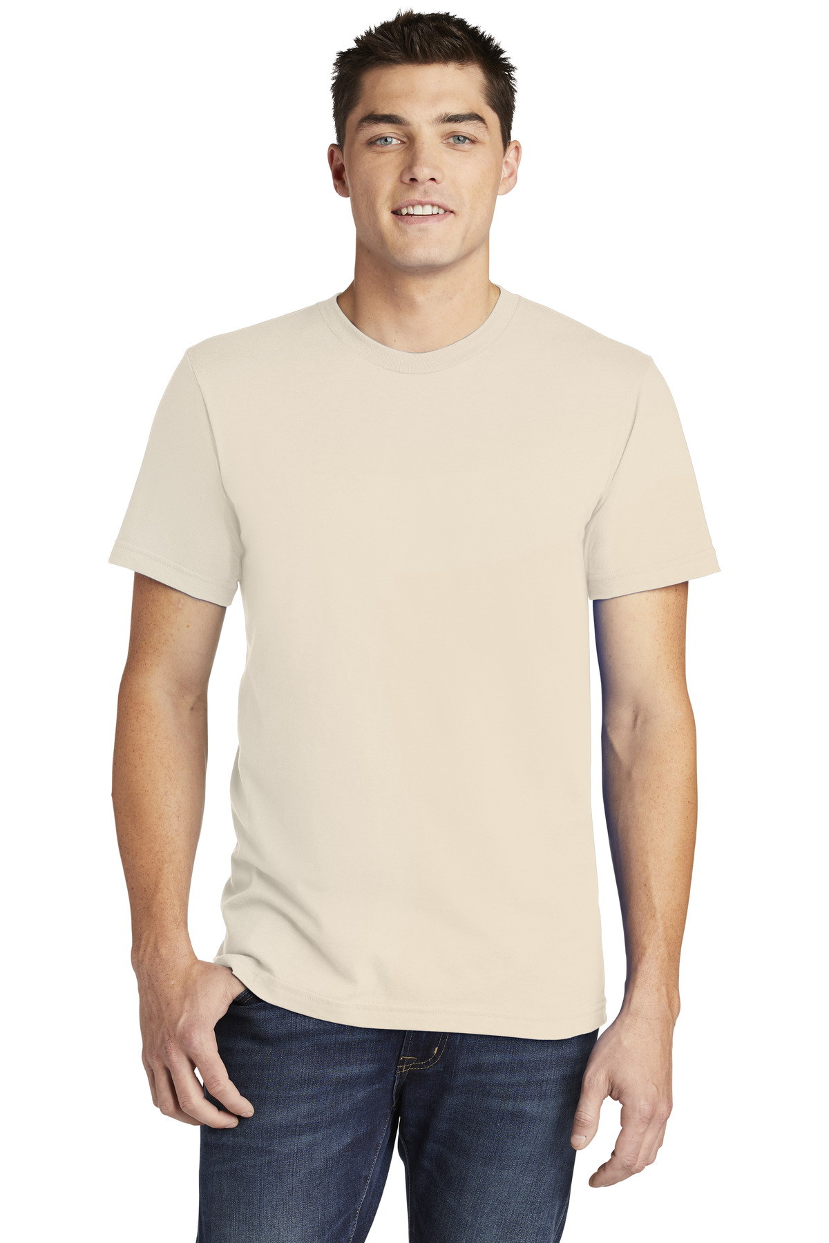 4.3-ounce, 100% combed ring spun US cotton, 30 singles 90/10 combed ring spun cotton/poly (Heather Grey) 99/1 combed ring spun cotton/poly (Ash Grey) 100% cotton thread on White Tear Away label; transitioning to recycled material Shoulder-to-shoulder taping Relaxed fit side-seamed body