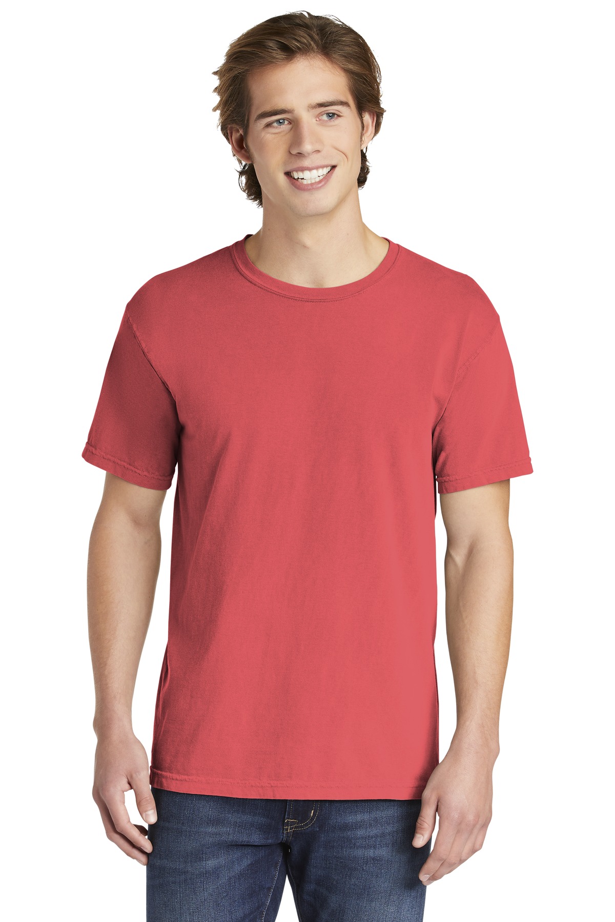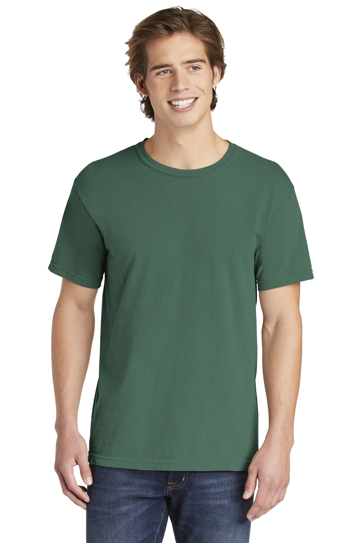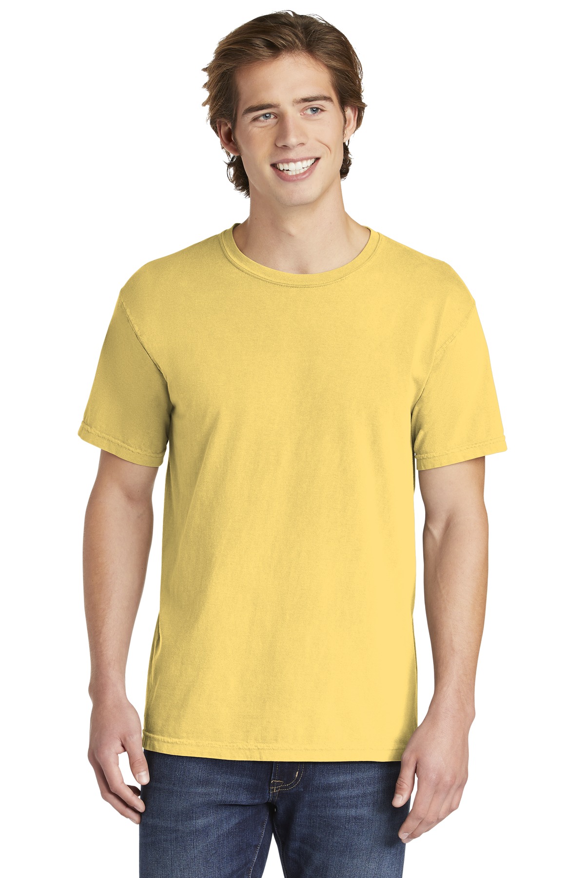 6.1-ounce, 100% US ring spun cotton Soft-washed, garment-dyed fabric Top-stitched, classic width rib collar Twill-taped neck and shoulders Twill label Relaxed fit, seamless body Double-needle collar and bottom hems The garment-dying process infuses each garment with unique character. Please allow for slight color variation in production and washing. Special consideration must also be taken when printing white ink on garment-dyed cotton.