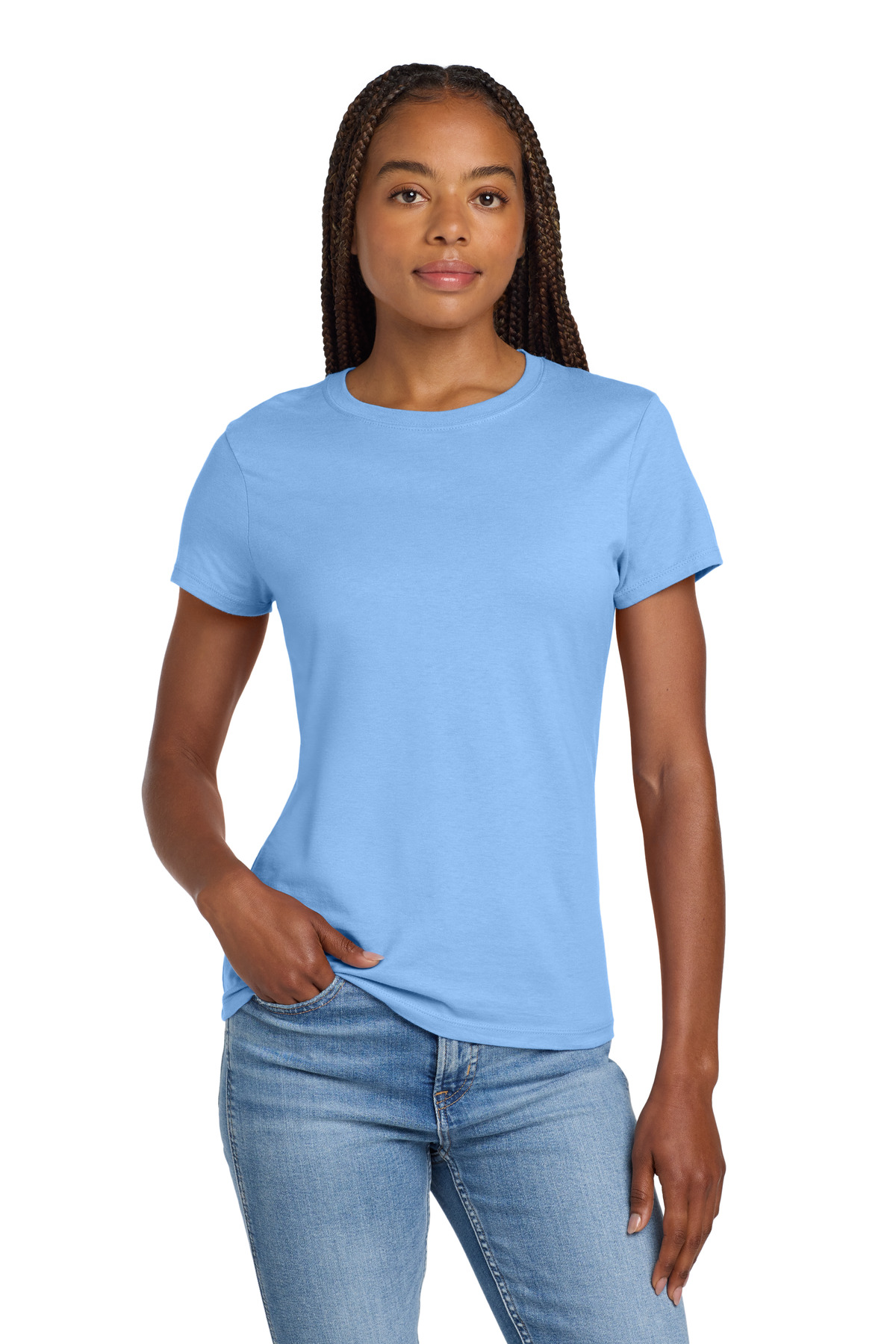| 4.5-ounce, 100% ring spun cotton 90/10 cotton/poly (Light Steel) Shoulder-to-shoulder taping Set-in rib knit collar with double-needle coverstitching at neck Tear-away label Contoured and side seamed for a classic feminine fit Please note: This product is transitioning from Nano-T labels to Perfect-T labels. Your order may contain a combination of both labels.