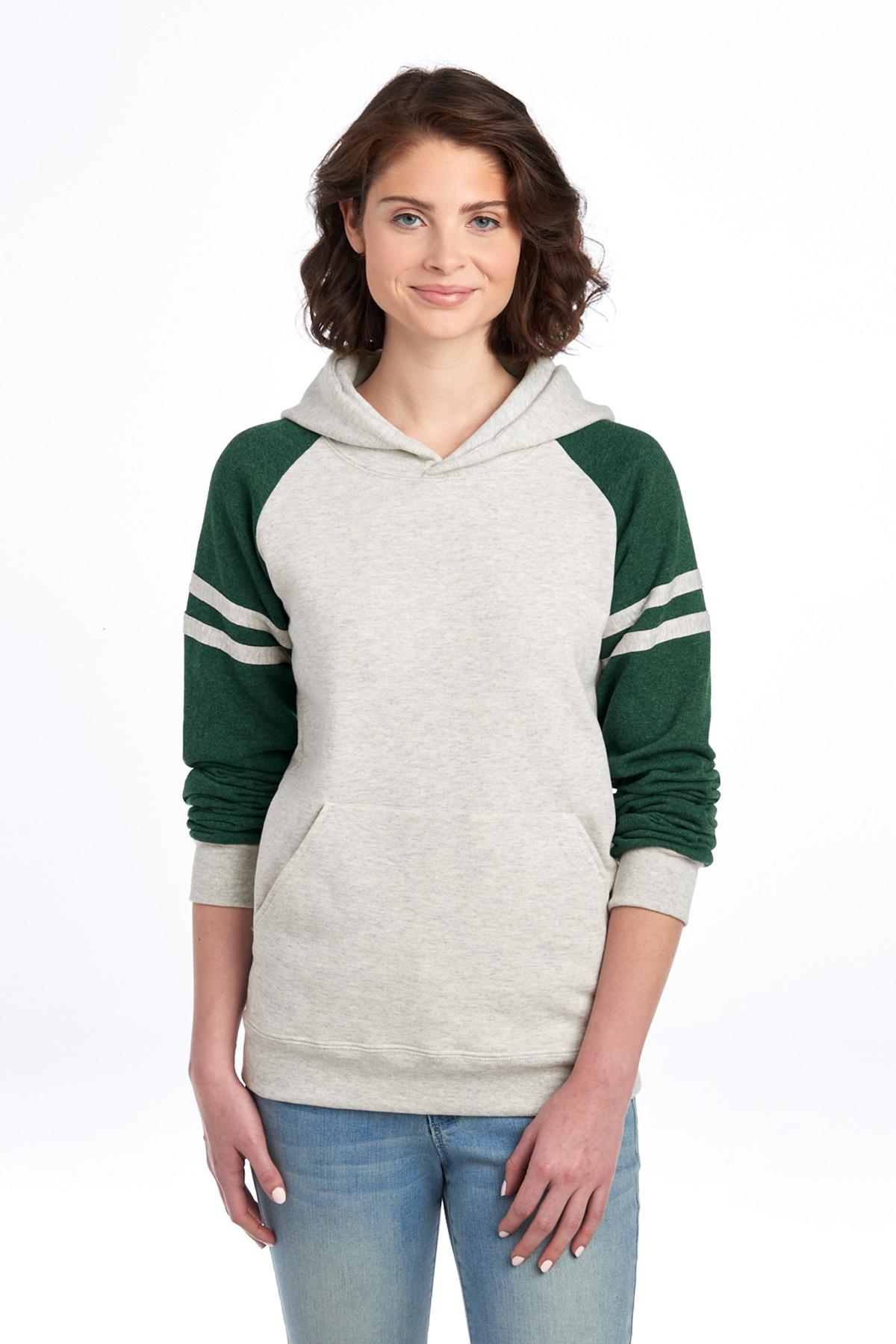 8-ounce, 50/50 cotton/polyester NuBlend ® pill-resistant fleece Made with sustainably sourced USA-grown cotton High stitch density for a smooth printing surface Jersey-lined hood No drawcord in hood Contrast raglan sleeves Athletic-inspired varsity stripes on sleeves Front pouch pocket 1x1 rib knit cuffs and hem Double-needle coverstitching on armholes and hem Tear-away label