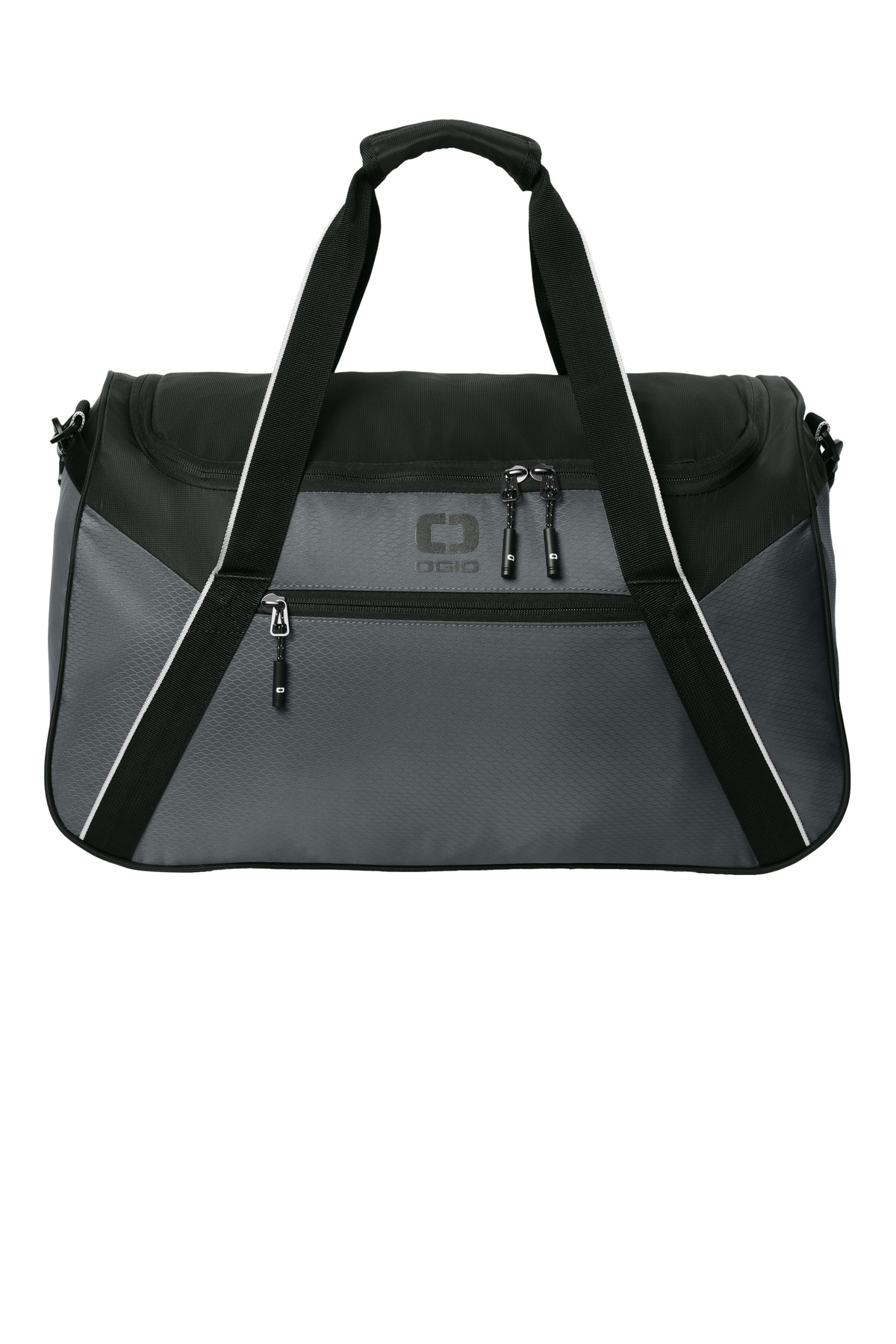 200D poly wave dobby PVC 200D recycled RPET poly mini grid dobby PU Padded wrap handle Interior left and right mesh storage pockets Contrast tipped webbing Zippered front pocket Removable, adjustable padded shoulder strap with black reflective OGIO heat transfer Luggage trolley pass through on back Padded foam bottom for strength Black reflective O icon heat transfer on front Dimensions: 12'h x 21'w x 12'd Capacity: 2,685 cu. in./44 L Weight: 1.43 lbs./0.7 kg Note: Bags not intended for use by children 12 and under.